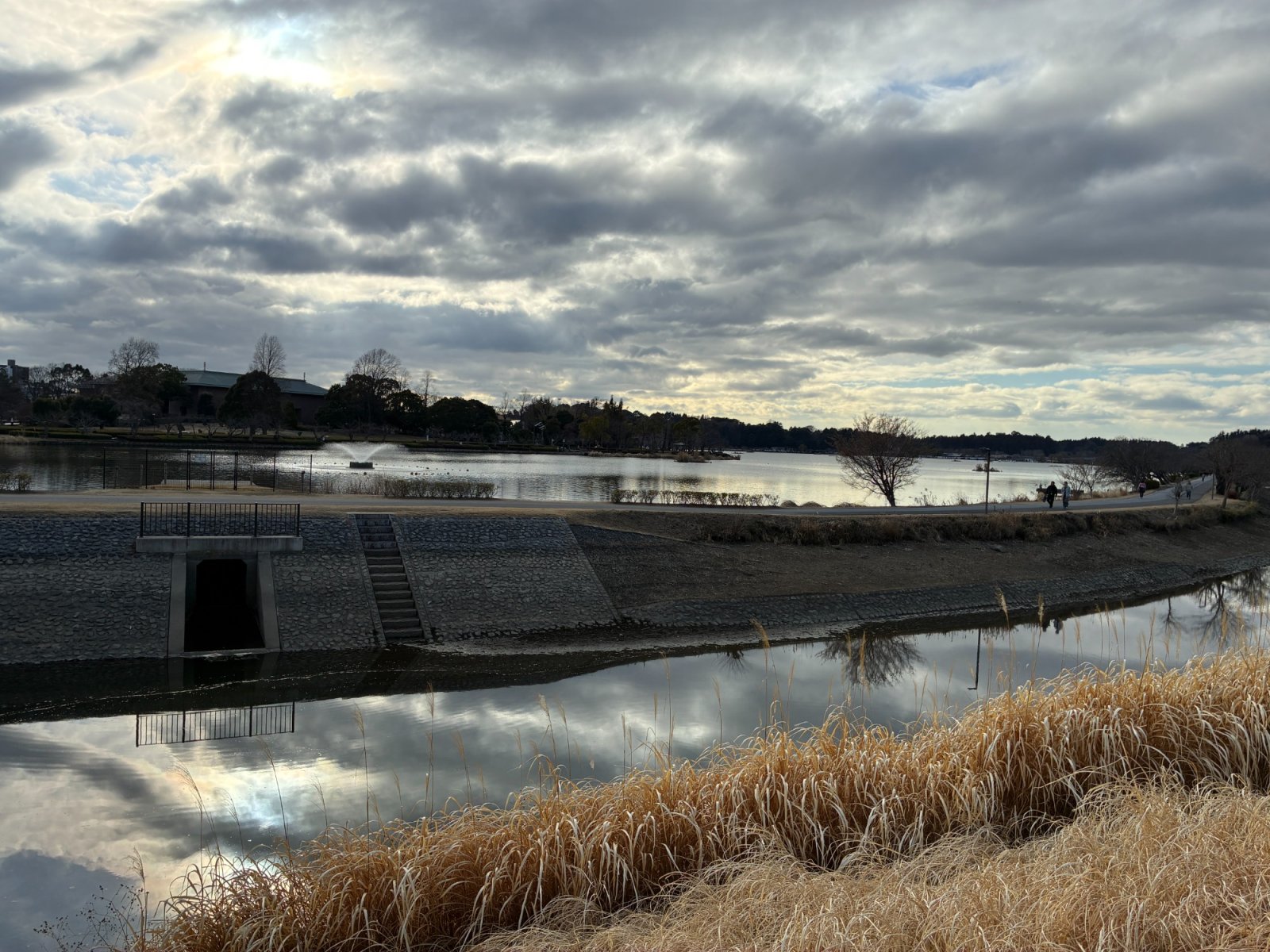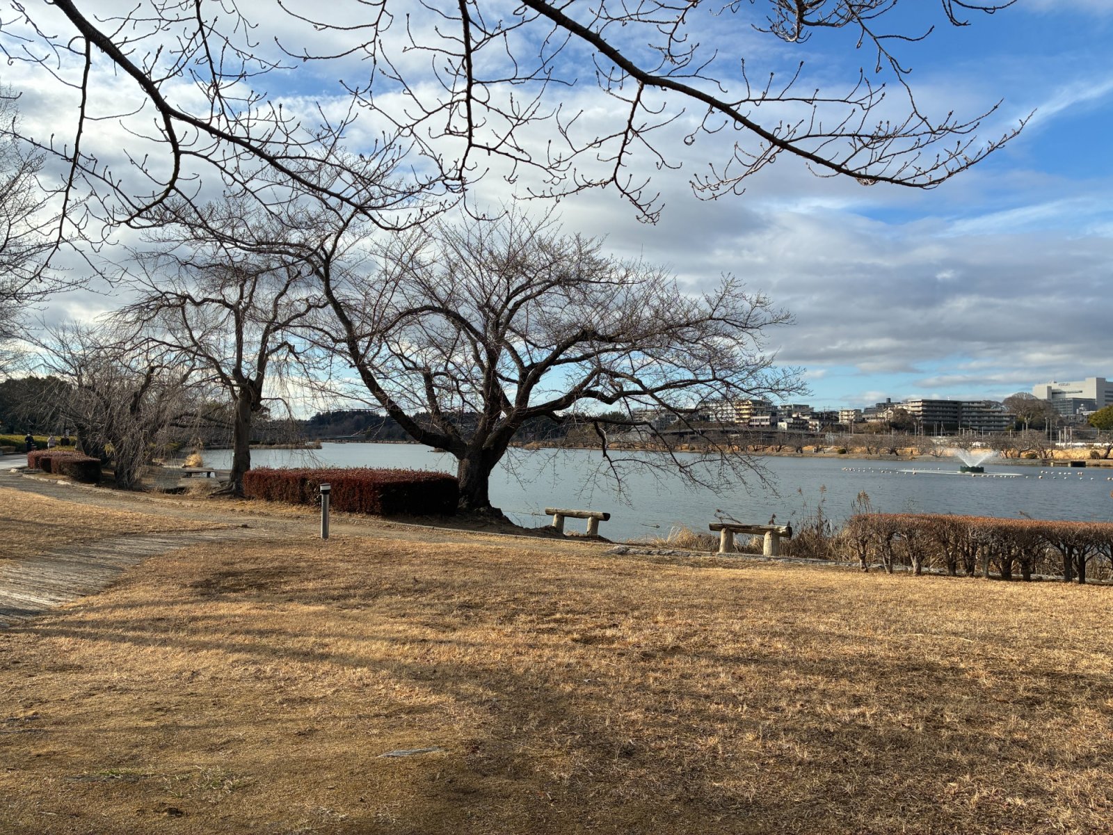 千波湖のほとりでは、ジョギングに励む人もいれば、ベンチで語らう人もいる。